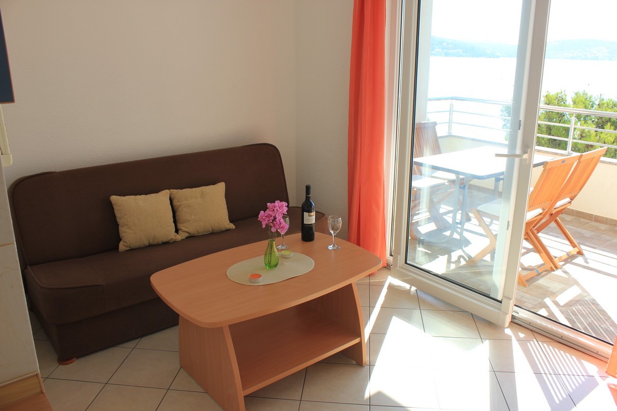 Apartman se sastoji od: 1 spavaća soba s bračnim krevetom, 1 spavaća soba s 2 odvojena kreveta, kuhinja, dnevni boravak, kupaonica s tušom, terasa 7m2 (prekrasan pogled na more).
